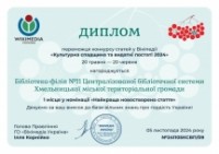 Завідуюча бібліотеки-філії №11 Алла Глива перемогла в конкурсі від Вікіпедії «Культурна спадщина та видатні постаті». Її та книгозбірню відзначили дипломами. А ще переможцям надіслали подарунок — дерев'яний кольоровий пазл із зображенням України.